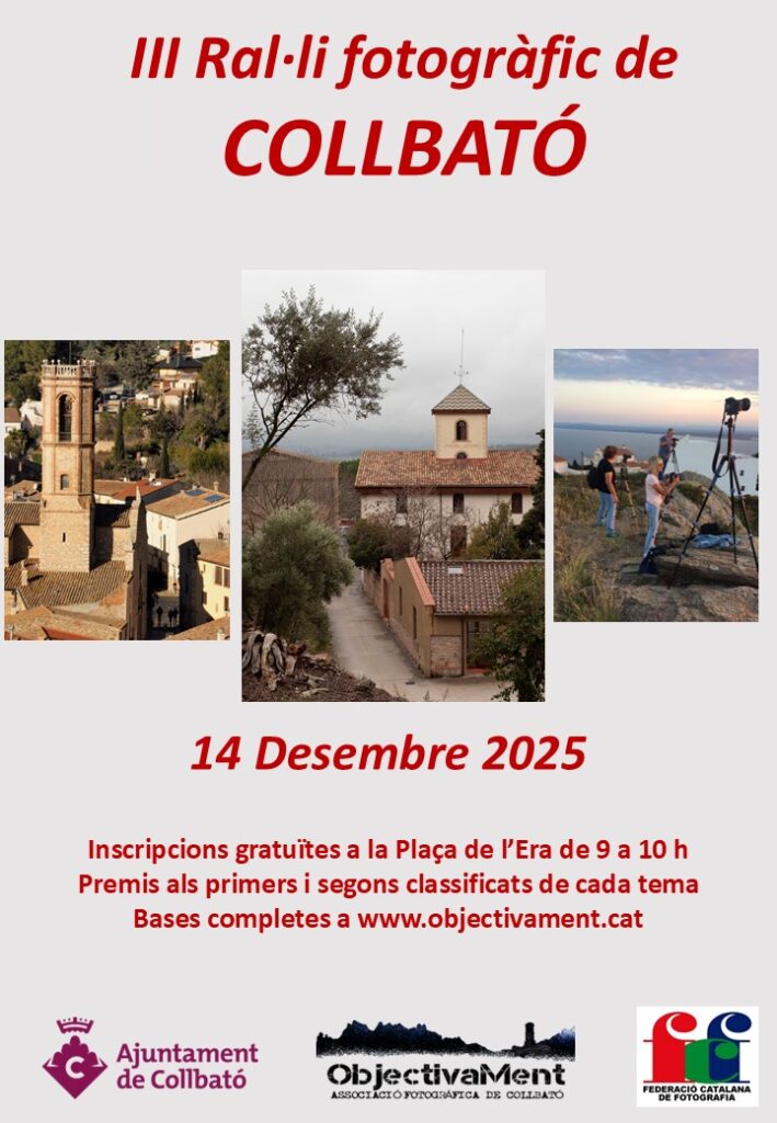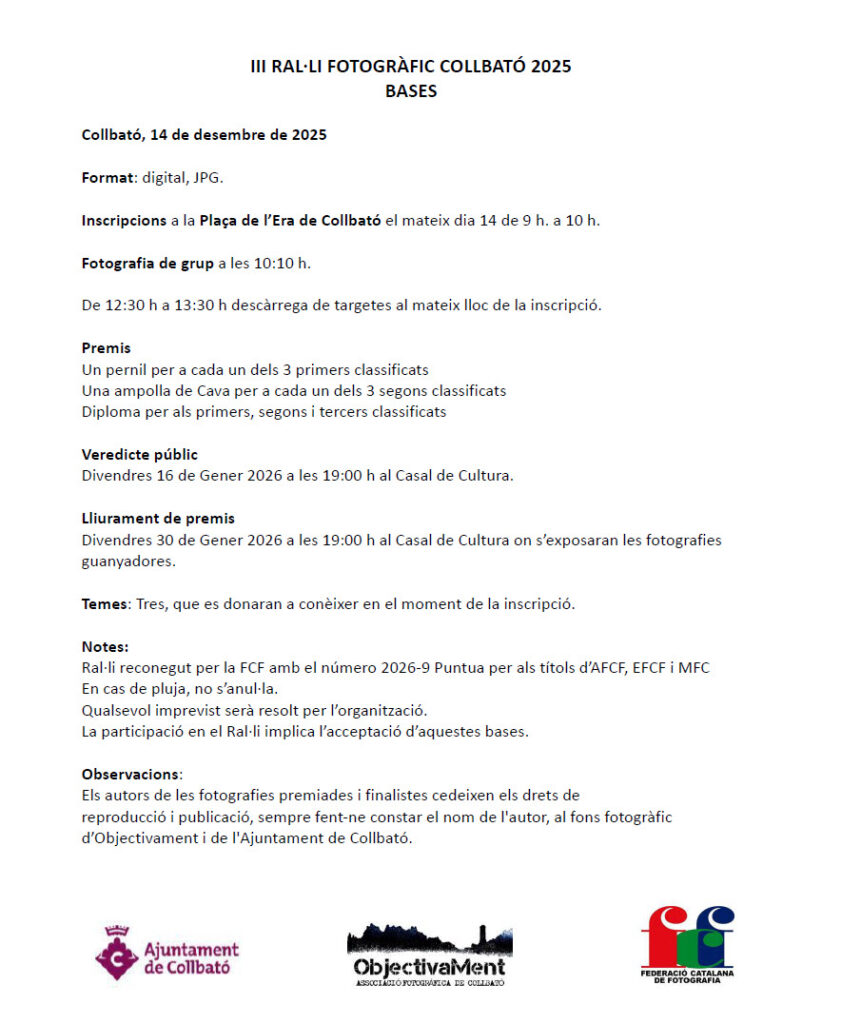 Qualsevol imprevist serà resolt per l’organització. La participació en el Ral∙li implica l’acceptació d’aquestes bases. Observacions: Els autors de les fotografies premiades i finalistes cedeixen els drets de reproducció i publicació, sempre fent‐ne constar el nom de l’autor, al fons fotogràfic de l’Ajuntament de Collbató.